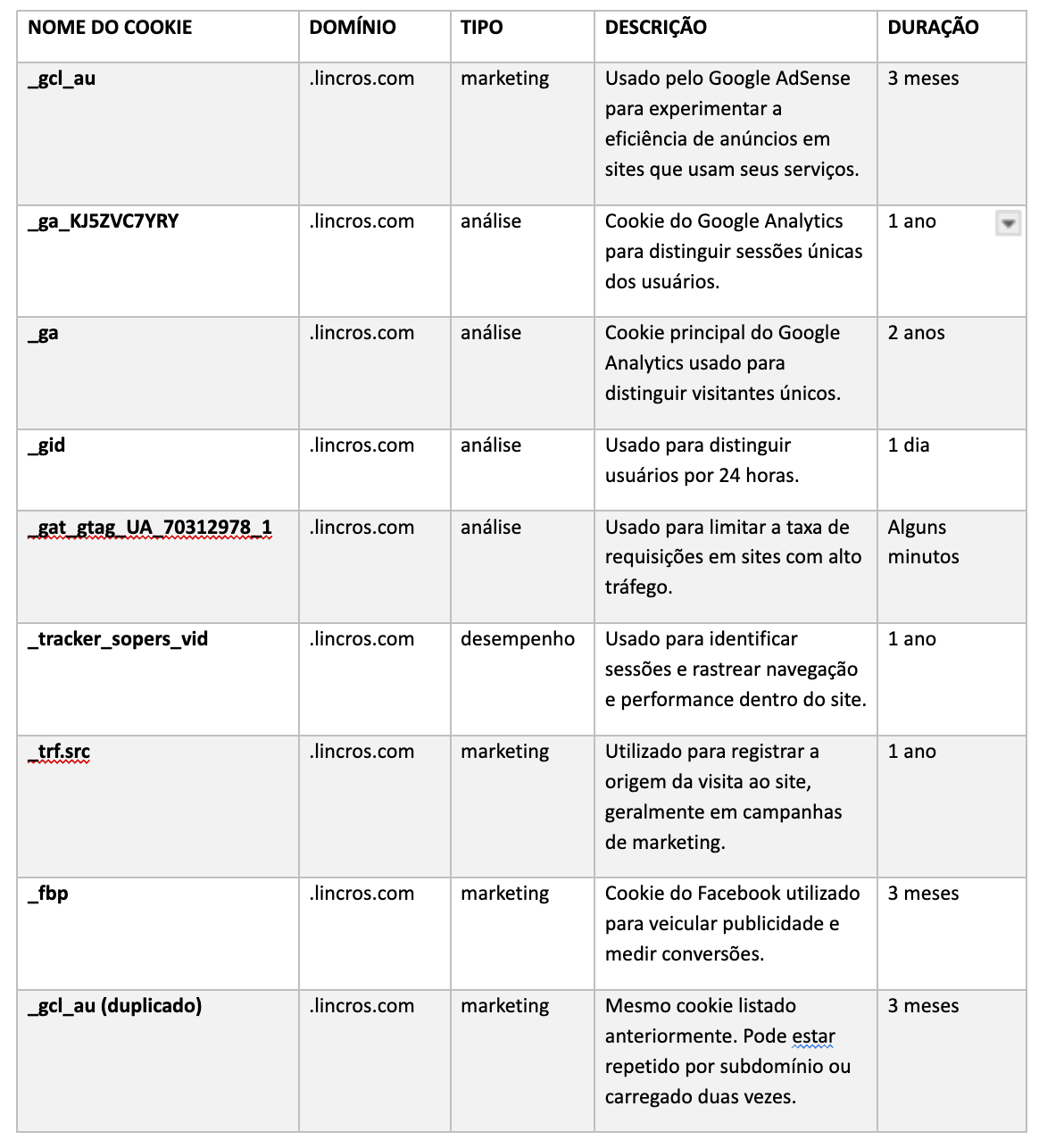 Abaixo estão os cookies identificados em nosso site e suas respectivas finalidades: